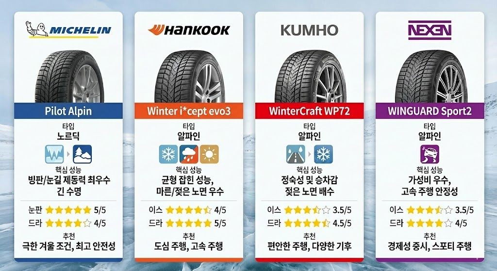스노우 타이어는 고무의 재질(컴파운드)이 다릅니다. 낮은 온도에서도 딱딱해지지 않고 말랑함을 유지해 접지력을 높여주죠. 국내에서 가장 인기 있는 4대 브랜드의 대표 모델을 소개합니다.